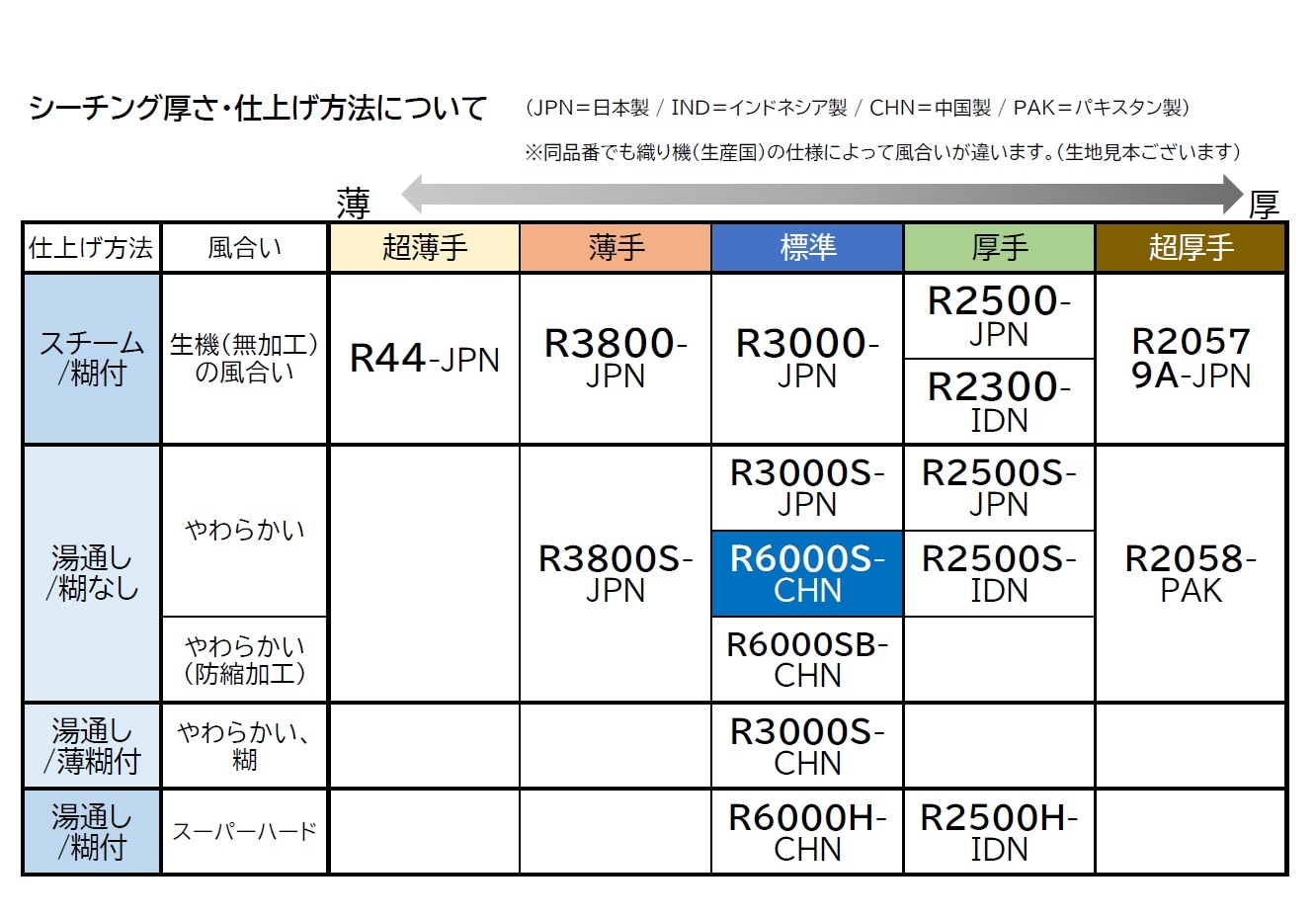 R3000と同じ生地厚さで湯通し済です ■ 商品説明 ※※シーチング商品名わかりやすく変更いたしました※※ 旧) ホリウチ シーチング R6000S ソフト (中国製) 無地柄 生成 綿100% 92cm巾×1反(55m) 湯通し 糊なし 即日発送 ↓ 新) ホリウチ シーチング 標準 R6000S-CHN-55m (中国製) 湯通し 糊なし 無地柄 生成 綿100% 92cm巾×1反(55m) 即日発送 <シーチング厚さ・仕上げ方法について> JPN=日本製 / IND=インドネシア製 / CHN=中国製 / PAK=パキスタン製 ※同品番でも織り機(生産国)の仕様によって風合いが違います。(生地見本ございます) ---------------------------------------- 現在までR3000ご利用いただいたお客様でよりソフトでしわのない物をお求めの方へ R3000と同じ生地厚さで湯通し済です。 R3000より柔らかい風合いで丁寧なしわ取り処理がしてあります! メリット1 しわが少ない メリット2 お湯の中に沈めてある為不純物が取られています。 メリット3 水に通してもサイズが変わりません(縮みません) タテ糸 30糸 72本 ヨコ糸 36糸 69本 合計141本 厚い→R2057 9A→R2500・R2300→R3000・R6000→R3800→R44薄い ********************************************* ※この商品は【洋裁の仮縫い用生地】です。 傷、汚れ、シワがあることがある程度あることが前提の低速織機で時間をかけてつくられた、 安価な綿100%の優しい自然の風合いの生地になります。 ※上記以外のご使用による、不都合や返品・交換には対応できません。 ※製品を作る生地、製品染、熱転写本来の目的以外のご使用の、返品・交換には対応できません。 ********************************************* ※製造工場・織機の個体差・綿花の状態・技術者・天候など様々の理由である一定の状態にしていますが、全く同じにすることはできないそうです。 ※生地としてご購入いただき製品をお作りのお客様から様々なご要望・要求をいただきますが、ご期待にお応えできない可能性がありますので、充分余裕を持ったデザイン・用尺をご用意ください。 ※使えない部分は廃棄、目的以外でご使用になられたお客様の責任にてお願します。 ※本来の仮縫い目的のご使用目的のお客様に安価に提供ができなくなるため、どうぞご協力お願いたします。 |