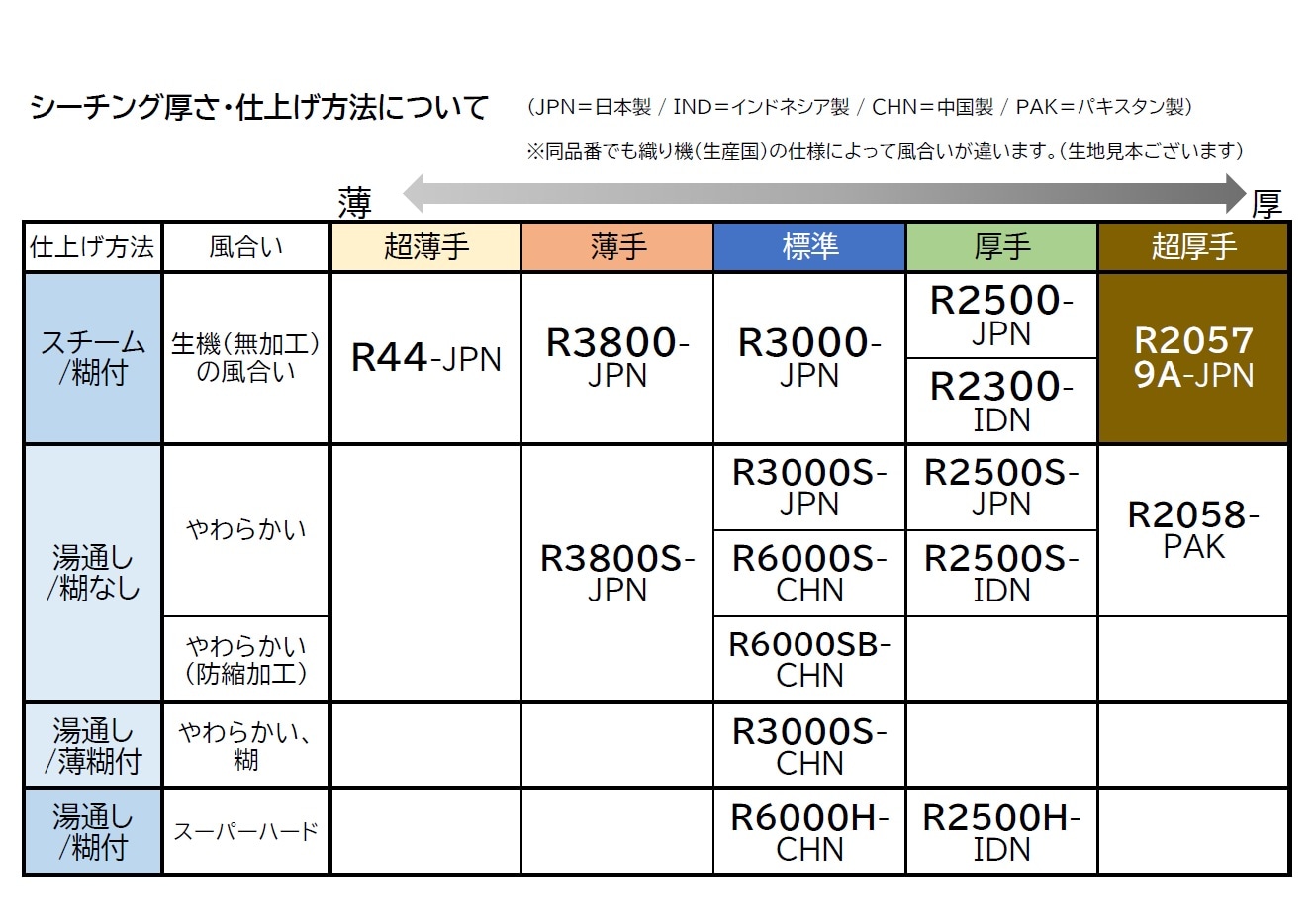 当社取り扱いシーチングで1番の厚手 10mカット ■ 商品説明 ※※シーチング商品名わかりやすく変更いたしました※※ 旧) ホリウチ かなり厚手 シーチング R2057 9A (日本製) 無地柄 生成 綿100% 95cm巾×10mカット スチーム加工 糊付 ↓ 新) ホリウチ シーチング じゃぱん 超厚手 R2057 9A-JPN-10m 綾織 (日本製) スチーム加工 糊付 無地柄 生成 綿100% 95cm巾×10mカット <シーチング厚さ・仕上げ方法について> JPN=日本製 / IND=インドネシア製 / CHN=中国製 / PAK=パキスタン製 ※同品番でも織り機(生産国)の仕様によって風合いが違います。(生地見本ございます) ---------------------------------------- 当社取り扱いシーチングで1番の厚手 身近な物でジーンズのポケットの袋布の厚さです。 コートなど厚い物の仮縫いや、強度の必要なしっかりした袋物作りに最適です。 サイズ:95cm巾×10m (1反74mもあります) 素材:綿100% 原産国:日本製 加工:スチーム加工 糊付 1インチ×1インチ 16の糸 縦75本 横55本 合計130本 厚い→R2057 9A→R2058S→R2500・R2300→R3000・R6000→R3800→R44薄い ********************************************* ※この商品は【洋裁の仮縫い用生地】です。 傷、汚れ、シワがあることがある程度あることが前提の低速織機で時間をかけてつくられた、 安価な綿100%の優しい自然の風合いの生地になります。 ※上記以外のご使用による、不都合や返品・交換には対応できません。 ※製品を作る生地、製品染、熱転写本来の目的以外のご使用の、返品・交換には対応できません。 ********************************************* 1 製品を作る生地 汚れが比較的落ちている湯通し、影響を受けにくい糊なしをお勧めします。 2 糊は均等につけられていません。はけで適当につけてあります。 その為、プリント転写など高温の熱を長時間かけると糊が跡になる場合があります。 3 傷・汚れがないものをご希望の場合は高速織機で作られてNEWシリーズをお願いします。 ********************************************* ※製造工場・織機の個体差・綿花の状態・技術者・天候など様々の理由である一定の状態にしていますが、全く同じにすることはできないそうです。 ※生地としてご購入いただき製品をお作りのお客様から様々なご要望・要求をいただきますが、ご期待にお応えできない可能性がありますので、充分余裕を持ったデザイン・用尺をご用意ください。 ※使えない部分は廃棄、目的以外でご使用になられたお客様の責任にてお願します。 ※本来の仮縫い目的のご使用目的のお客様に安価に提供ができなくなるため、どうぞご協力お願いたします。 |