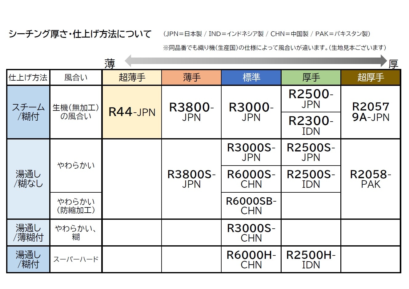 ホリウチ シーチング じゃぱん 超薄手 R44-JPN-60m (日本製) スチーム加工 糊付 無地柄 生成 綿100% 112cm巾×1反(60m) ■ 商品説明 ※※シーチング商品名わかりやすく変更いたしました※※ 旧) ホリウチ かなり薄手 シーチング R44 (日本製)無地柄 生成 綿100% 112cm巾×1反(60m) スチーム加工 糊付 ↓ 新) ホリウチ シーチング じゃぱん 超薄手 R44-JPN-60m (日本製) スチーム加工 糊付 無地柄 生成 綿100% 112cm巾×1反(60m) <シーチング厚さ・仕上げ方法について> JPN=日本製 / IND=インドネシア製 / CHN=中国製 / PAK=パキスタン製 ※同品番でも織り機(生産国)の仕様によって風合いが違います。(生地見本ございます) ---------------------------------------- ガーゼの様な風合いのシーチング ブラウス・ワイシャツの仮縫い用に最適 サイズ:112cm巾×60m乱 (10mカットも販売しております) 素材:綿100% 原産国:日本製 加工:スチーム加工 糊付 糸番手(極薄) タテ 40糸 56本 ヨコ 40糸 50本 合計106本 厚い→R207 9A→R2500→R3000→R3800→R44薄い ********************************************* ※この商品は【洋裁の仮縫い用生地】です。 傷、汚れ、シワがあることがある程度あることが前提の低速織機で時間をかけてつくられた、 安価な綿100%の優しい自然の風合いの生地になります。 ※上記以外のご使用による、不都合や返品・交換には対応できません。 ※製品を作る生地、製品染、熱転写本来の目的以外のご使用の、返品・交換には対応できません。 ********************************************* 1 製品を作る生地 汚れが比較的落ちている湯通し、影響を受けにくい糊なしをお勧めします。 2 糊は均等につけられていません。はけで適当につけてあります。 その為、プリント転写など高温の熱を長時間かけると糊が跡になる場合があります。 3 傷・汚れがないものをご希望の場合は高速織機で作られてNEWシリーズをお願いします。 ********************************************* ※製造工場・織機の個体差・綿花の状態・技術者・天候など様々の理由である一定の状態にしていますが、全く同じにすることはできないそうです。 ※生地としてご購入いただき製品をお作りのお客様から様々なご要望・要求をいただきますが、ご期待にお応えできない可能性がありますので、充分余裕を持ったデザイン・用尺をご用意ください。 ※使えない部分は廃棄、目的以外でご使用になられたお客様の責任にてお願します。 ※本来の仮縫い目的のご使用目的のお客様に安価に提供ができなくなるため、どうぞご協力お願いたします。 ********************************************* ★★★横浜市「販路開拓支援事業」認定商品です★★★ 当店の「国産シーチング」は、 令和7年度 横浜市 販路開拓支援事業に採択されました。 (認定対象商品リストは → 横浜市公式サイト) https://www.city.yokohama.lg.jp/business/kigyoshien/keieishien/kaihatsu/hanro/jisseki/2025nintei.html 洋裁・手芸で長年親しまれてきたシーチングを、 国内工場で一貫生産し、品質・衛生面にもこだわっています。 市の認定を受けた安心の日本製生地として、 プロの方からご家庭用まで、幅広くご利用いただけます。 弊社製造商品であり、卸販売は一切行っておりません。 また、弊社ロゴや商品画像を無断使用しているサイトがございますが、 弊社はこれらのサイトへ一切の卸・販売を行っておりません。 お求めの際は、弊社直営の販売ページをご利用ください。 |