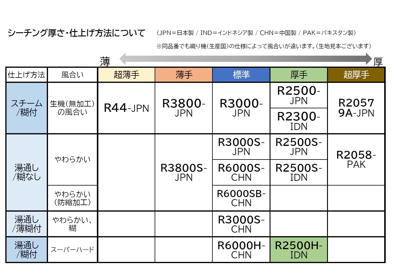 R2500Hハード ■ 商品説明 ※※シーチング商品名わかりやすく変更いたしました※※ 旧) ホリウチ 厚手 シーチング R2500H ハード (中国製) 無地柄 生成 綿100% 92cm巾×1反(55m) 湯通し 糊付 即日発送 ↓ 新) ホリウチ シーチング 厚手 R2500H-IDN-55m ハード (インドネシア製) 湯通し 糊付 無地柄 生成 綿100% 92cm巾×1反(55m) 即日発送 ※生産国変更 中国→インドネシア <シーチング厚さ・仕上げ方法について> JPN=日本製 / IND=インドネシア製 / CHN=中国製 / PAK=パキスタン製 ※同品番でも織り機(生産国)の仕様によって風合いが違います。(生地見本ございます) ---------------------------------------- R2500Hハード あつ サイズ:92cm巾×1反(55m) 素材:綿100% 原産国:インドネシア製 加工: 湯通し 糊付 タテ糸 20糸 60本 ヨコ糸 20糸 60本 合計120本 厚い→R2057 9A→R2500・R2300→R3000・R6000→R3800→R44薄い ********************************************* ※この商品は【洋裁の仮縫い用生地】です。 傷、汚れ、シワがあることがある程度あることが前提の低速織機で時間をかけてつくられた、 安価な綿100%の優しい自然の風合いの生地になります。 ※上記以外のご使用による、不都合や返品・交換には対応できません。 ※製品を作る生地、製品染、熱転写本来の目的以外のご使用の、返品・交換には対応できません。 ********************************************* 1 製品を作る生地 汚れが比較的落ちている湯通し、影響を受けにくい糊なしをお勧めします。 2 糊は均等につけられていません。はけで適当につけてあります。 その為、プリント転写など高温の熱を長時間かけると糊が跡になる場合があります。 3 傷・汚れがないものをご希望の場合は高速織機で作られてNEWシリーズをお願いします。 ********************************************* ※製造工場・織機の個体差・綿花の状態・技術者・天候など様々の理由である一定の状態にしていますが、全く同じにすることはできないそうです。 ※生地としてご購入いただき製品をお作りのお客様から様々なご要望・要求をいただきますが、ご期待にお応えできない可能性がありますので、充分余裕を持ったデザイン・用尺をご用意ください。 ※使えない部分は廃棄、目的以外でご使用になられたお客様の責任にてお願します。 ※本来の仮縫い目的のご使用目的のお客様に安価に提供ができなくなるため、どうぞご協力お願いたします。 |