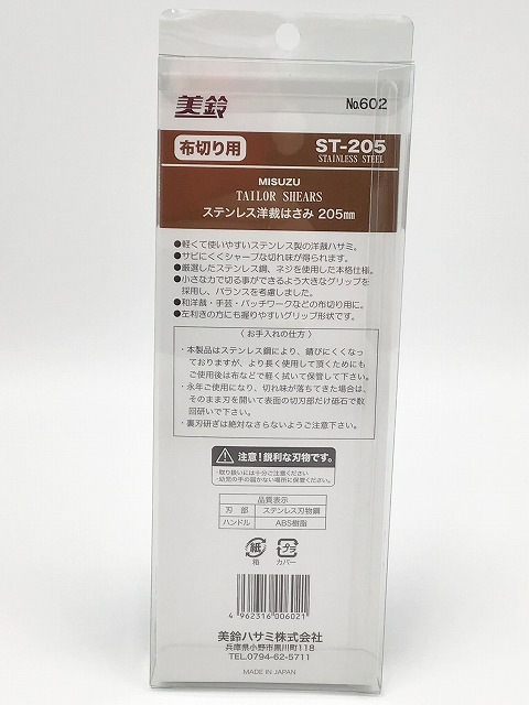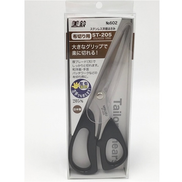 大きなグリップで楽に切れる! ■ 商品説明 厚いステンレス製ブレード(刃)でしっかりと切れます。和洋裁・手芸パッチワークなどの布切り用に。 ●軽くて使いやすいステンレス製の洋裁ハサミ。 ●サビにくくシャープな切れ味が得られます。 ●厳選したステンレス鋼、ネジを使用した本格仕様。 ●小さな力で切る事ができるような大きなグリップを採用し、バランスを考慮しました。 ●和洋裁・手芸・パッチワークなどの布切り用に。 ●左利きの方にも握りやすいグリップ形状です。 サイズ:全長約205mm 刃長約80mm 重量:約95g |