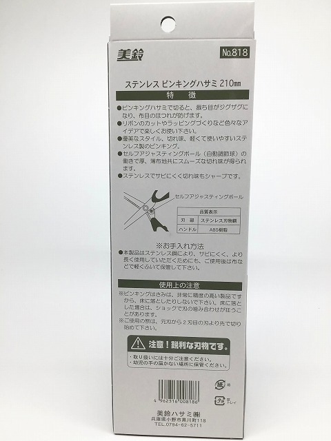優美なスタイル、切れ味、軽くて使いやすいステンレス製のピンキング ■ 商品説明 ●優美なスタイル、切れ味、軽くて使いやすいステンレス製のピンキング。 ●家庭での趣味に最適です。 ●リボンのカットやラッピングづくりなど色々なアイデアで楽しくお使い下さい。 厳選されたステンレス刃物鋼を、最新の技術で高精度に仕上げています。 ●セルフアジャスティングボール(自動調節球)の働きで厚、薄布地共にスムーズな切れ味が得られます。 ※研ぎ直し修理はできません。 サイズ:約215mm 刃渡約75mm 質量:約140g |