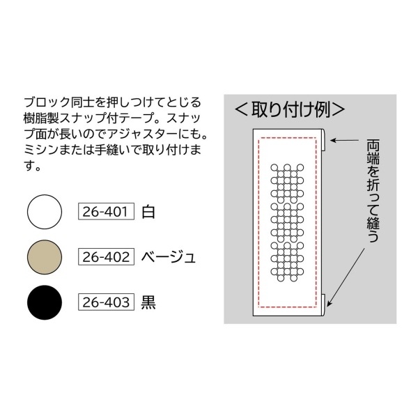 開ける音が静かなブロック型スナップ付きテープ。 バッグや小物、アウターに。 ■ 商品説明 開ける音が静かなブロック型スナップ付きテープ。 バッグや小物、アウターに。 ブロック型の樹脂製スナップ付テープです。ブロック同士を押しつけてスナップのように閉じます。テープを縫って取り付けます。 開ける時にバリバリ音がせず、繊維のからみつきもありません。 スナップ面が長いので袖口を調整するアジャスターとしても使用できます。 使い方 ・使用したい長さに切り、テープ部分をミシンまたは手縫いで布地に取り付けます。(ブロック型スナップが合わせられるよう取り付けます) ・テープをカットして1組ずつ使用することもできます。 ・カットしたテープの両端は、内側に折って縫うか、または端が出ないように縫い込んでください。 ・ミシンで縫う時は「ファスナー押さえ」を使用してください。 旅行やビジネス、デイリーで使うバッグをハンドメイドしませんか?そんな時重要なのがパーツ類。機能的なカジュアルバッグのソーイングにお使いください。 内容物: テープ部:21mm幅×約59cm スナップ部:10×36mm 8ブロック付(4組) ※スナップ部にはアイロンをかけないでください。(アイロン熱で溶けます) ※テープ部にアイロンをかける時は、あて布を使用して低温(110℃)でかけてください。 材質:テープ部:ポリエステル100% スナップ部:ポリアセタール 原産国:日本 パッケージサイズ:50×180×7mm 商品番号:26-402 |