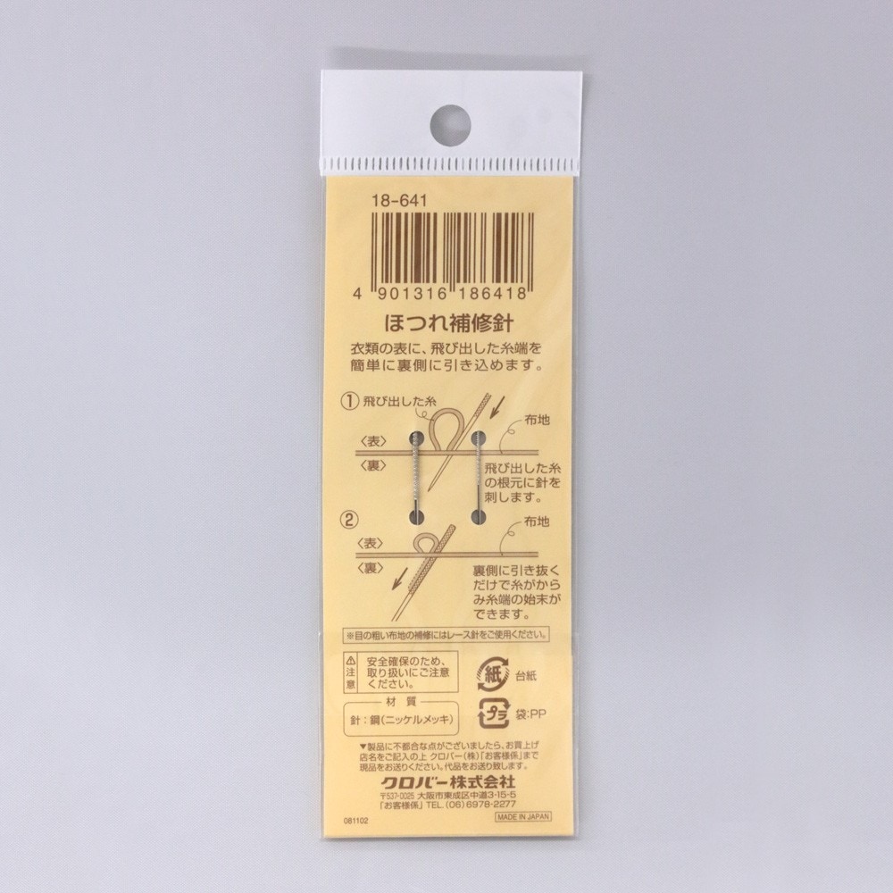 飛び出た糸を簡単に始末できます ■ 商品説明 飛び出た糸を簡単に始末できます。 太針と細針のセットです。 衣服などの表に飛び出た糸のほつれを簡単に補修できます。 サイズ・容量 2本入(太針)太さ0.90mm/(細針)太さ0.61mm・長さ各65mm 規格 ■生産地:日本 |