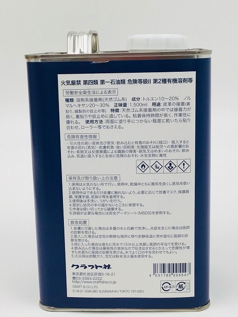 天然ゴム系接着剤です ■ 商品説明 ◆用途/特徴 天然ゴム系接着剤です。天然ゴム系の中でも接着力が弱く特に裏貼りや仮止めに適しています。 ◆使用法 接着面の両面とも薄く隙間なく均一に塗り、半乾きの状態まで少し時間を置いてから貼り合わせます。その後ローラーで抑えたり、木槌で叩いたりして圧着します。 |