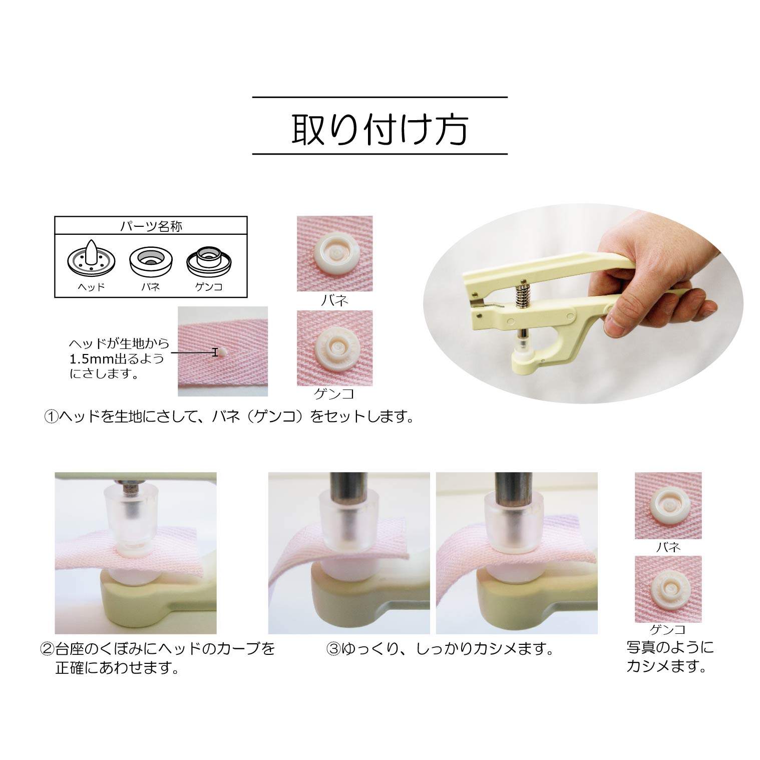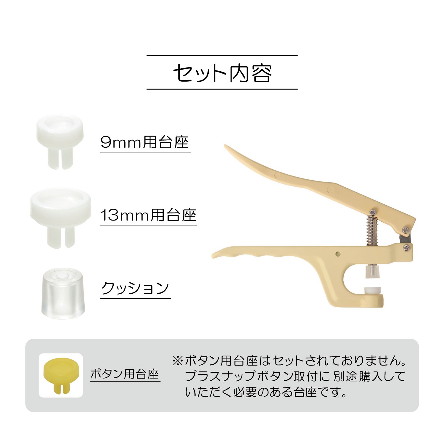 プラスナップの取り付けに使用します。 ■ 商品説明 プラスナップの取り付けに使用します。 台座を取替えれば、色々なプラスナップを付けられます。 9ミリ用、13ミリ用台座、クッション付。 使用上の注意 サンコッコー「プラスナップ」専用です。 素材/成分 本体:アルミダイキャスト・クッション:ポリウレタンエラトマー・台座:ポリアセタール 生産国/原産国 日本 |
