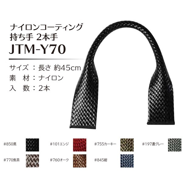長さ約45cm ■ 商品説明 ナイロンコーティング 持ち手 2本手 柔らかく鞄に取り付けやすい人気の持ち手です。 端をしっかり加工処理してあるので鞄の表に出してもほつれてきません。 ツヤを抑えマットに仕上げてあるので高級感があります。 ■サイズ/長さ約45cm ■素材/ナイロン ■入数/2本 |