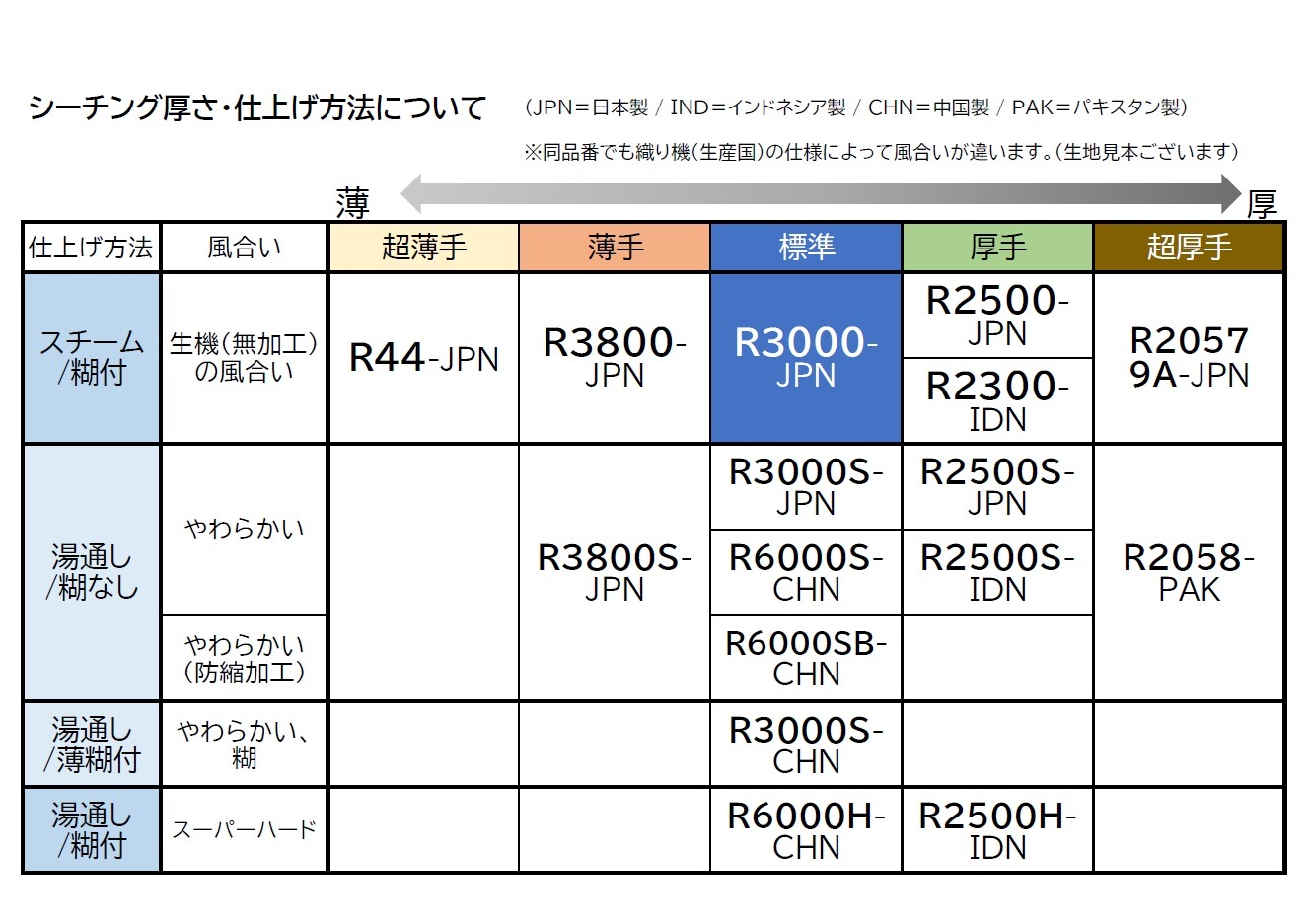 R3000S(中国製)に比べ、同じ生地の厚さですが仕上げ処理が異なる為、手触り、生地の風合いが若干異なっております。中国製は柔らかく、ねっとりした風合い 日本製はサラッとしたハリのある風合いです。